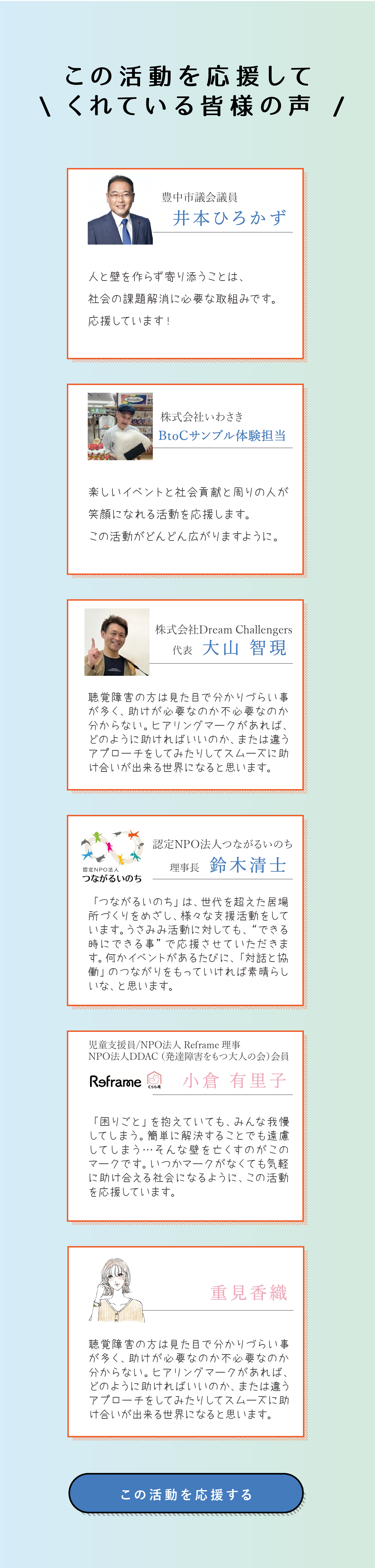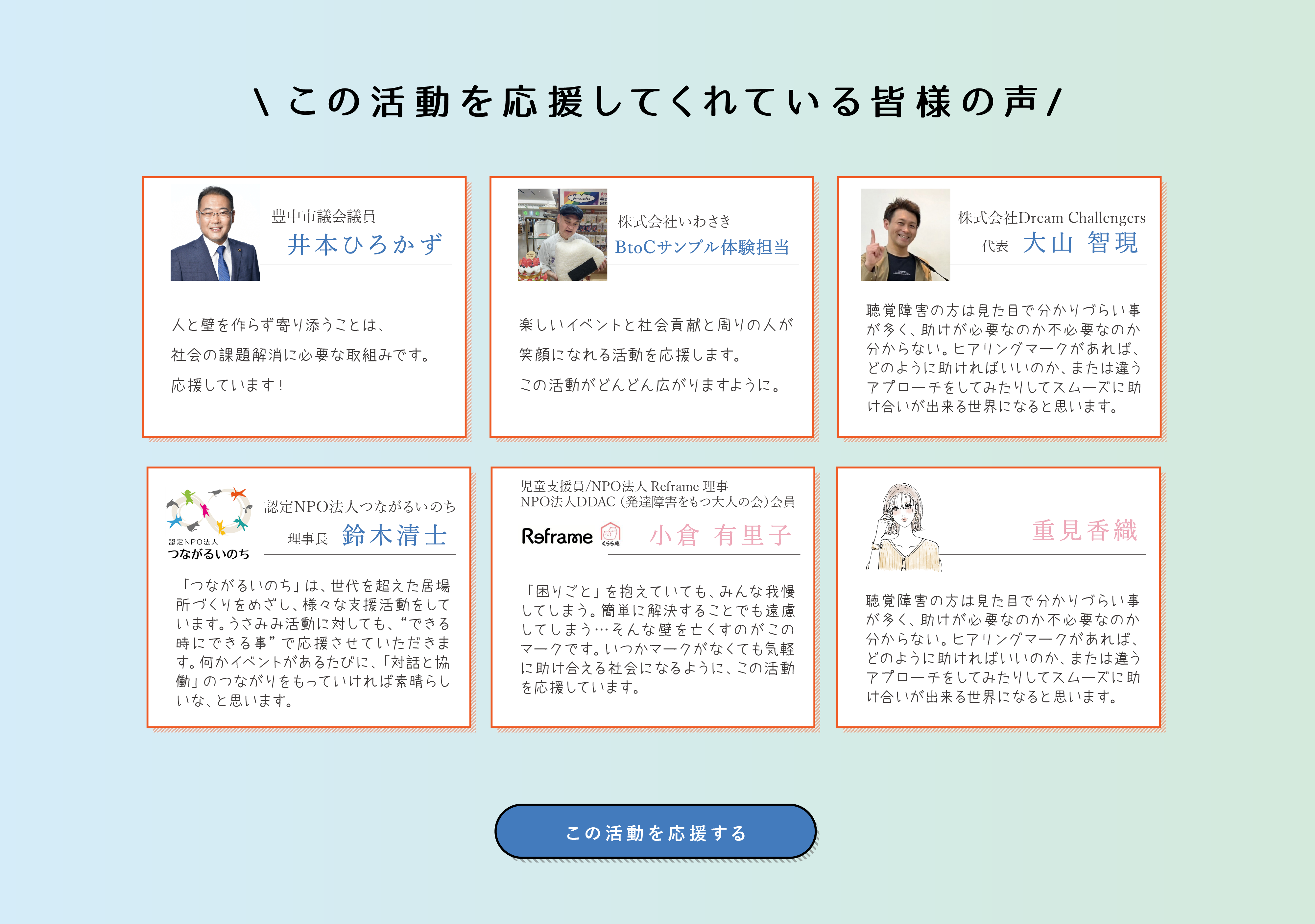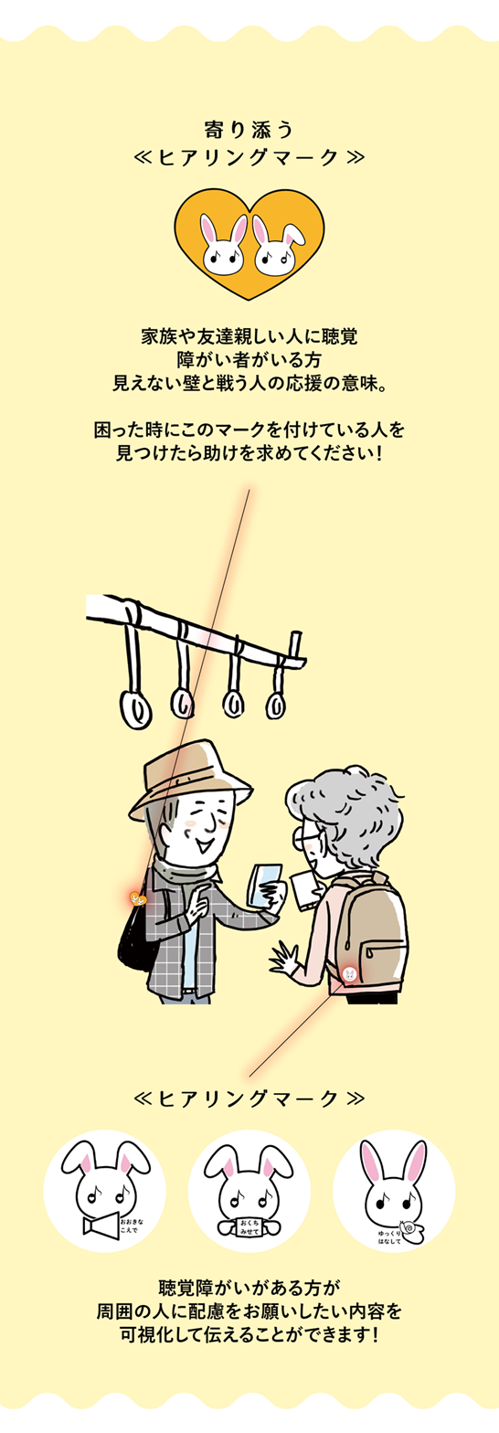 聴覚障害の支援をするために聞きますよ!という意味のヒアリングマークを広める活動です。